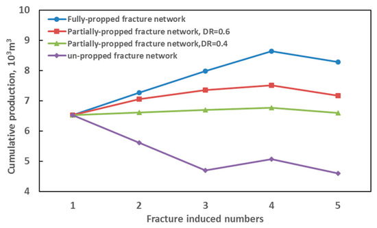 We also investigate he cumulative production with different induced fracture deviation angles (Figure 11). It is illustrated that the reservoir contact area of the fracture network increases with the bifurcation angle (deviation angle). When fractures are featured by high conductivity, it is inappropriate to create a denser network in the stimulated reservoir volume, and only a few interweaving fractures can result in very good performance. The cumulative oil production of the partially-propped fracture case is fairly close to the others, and the effect of fracture morphology on yield is not great. When it comes to lower conductivity fractures, the effect of the main fracture substantially overweighs the secondary and tertiary fractures.