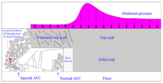 Longwall top-coal caving methods were initially developed in France and the former Soviet Union in the 1950s [4], and are mainly used for thick coal seam mining. The lower section of the thick coal seam is cut by a traditional longwall set-up, except for the chock supports in the working face, which have a longer, rear caving shield extending past into the goaf. The extended caving shield has a sliding door fitted into it. An additional armored face conveyor (AFC) is attached to the rear of the chock supports and runs directly below the caving shield openings. As the face moves forward, the coal (the top-coal) left above the cutting section is fractured under the action of the front abutment pressure (i.e., the strata pressure) and falls onto the extended canopies, as long as the goaf is caving normally. The sliding doors in the extended canopies are sequentially opened, and the coal falls through onto the rear-mounted AFC, as shown in Figure 1.