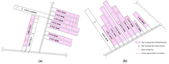 After reviewing the literature, it was noticed that the chock support failure accidents reported are mainly in fully mechanized mining faces of shallow coal seams, in the Shendong coalfield [6,7], while chock support failure accidents in LTCC faces are rarely reported. Also, in recent years the research relating to LTCC has concentrated mainly on the mechanisms of top-coal caving and technical measures to improve the top-coal recovery rate [8,9,10,11,12,13,14,15,16,17,18,19]. Many scholars have conducted studies on the influence of the front abutment pressure [8], coal seam dip [9], coal strength [10,11], fracture distribution and stress conditions [12,13], thickness of top-coal [14], size of the top-coal blocks [15] and support working resistance [16] on the cavability of top-coal, and the corresponding measures to improve the cavability and recovery rate of top-coal [17,18,19].