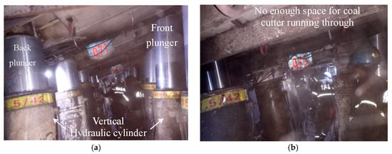 When the LTCC-west8101 advanced/mined over 98 m, the first weighting appeared. The strata behavior of the working face enhanced significantly for the No. 45–60 chock supports with a range of 26 m, and the plunger of the vertical hydraulic cylinder descended by over 400 mm. Fortunately, the intense ground pressure had not yet affected the mining productions. However, when the working face advanced/mined over 115 m, the second weighting occurred. The plungers of the vertical hydraulic cylinder of the No. 60–87 chock supports descended rapidly. To be specific, the shrinkage of the front and back plungers of the No. 60–71 chock supports reached up to 700 mm and 1000 mm respectively in less than 15 min, as shown in Figure 3a. After 30 min, the hydraulic cylinders of the No. 74–85 chock supports were totally crushed, almost all the safety valves were damaged and the miners had to stoop forward, as shown in Figure 3b. Because of this chock support failure accident, production in this working face stopped for 2 days.