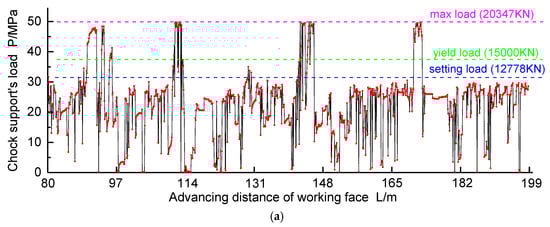 In the period of weighting, chock supports with sufficient capacity can control the roof subsidence effectively. Also, there is less shrinkage in the plungers of the vertical hydraulic cylinders along with moderate strata behavior in the working face. However, if the capacity of the supports is insufficient, there could be a significantly increasing roof subsidence which results in intense strata behavior in working faces. The load of the chock supports was monitored with the advancing/mining of LTCC-west8101. Taking the No. 65, No. 75 and No. 85 chock support in the center of LTCC-west8101 as an example, results of monitoring the load of chock supports can be seen in Figure 5.