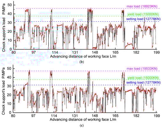 Various measures are taken to weaken the top-coal and improve its cavability to avoid chock support failure accidents. Hydraulic fracturing is the most effective way to weaken the top-coal in situations in which explosives are not feasible due to high gas levels, such as in LTCC-west8101. Referring to the layout method of the fracturing drill holes on hard coal seams [20,27], hydraulic fracturing is conducted in LTCC-west8101. In the mining process, the top-coal is fractured in advance. The drill holes are drilled on the working face and the two measure lanes which are excavated along the roof are both 62.5 m from the air-return-roadway and belt conveyor roadway respectively, as shown in Figure 13a,b. The oblique drill holes are drilled between the supports at a distance of 8.75 m (every five supports) and the drill hole is inclined to the coal wall in front of the working face at an angle of 70°, as shown in Figure 13c. The depth of the drill hole is 14 m (1 m higher than the top-coal). The pump pressure is 45 MPa, and the pump is stopped after 20 min of hydraulic fracturing or when the orifice water pressure is below 20 MPa. The horizontal drill holes, whose depths along the perpendicular to the mining direction vary at about 30 m or 40 m, are drilled at an interval of 10 m along the mining direction in the measure lane. The horizontal drill holes are drilled at least 40 m ahead of the working face in the measure lane, meaning five horizontal drill holes drilled in each column, as shown in Figure 13a. The pump pressure is 45 MPa, and the pump is stopped after 1 h of hydraulic fracturing or when the orifice water pressure is below 20 MPa. The relative parameters can be determined according to the research findings [20,27].