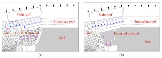 Being sandwiched between the main roofs and the supports, the top-coal is the medium through which the load of the main roof is transferred to the chock supports. Generally, if the coal strength is low and the front abutment stress is high, the top-coal can be broken easily into small pieces or blocks, resulting in successive top-coal caving. Furthermore, the crushing and caving of top-coal disperses the pressure of the main roof (“F”, as shown in Figure 6a), and as a result, the pressure from the main roof inflicted on the supports is alleviated, as shown in Figure 6a. However, if the top-coal is hard, the top-coal cannot be broken effectively and overhanging of the top-coal will occur, resulting in the pressure of the main roof (“F”, as shown in Figure 6b) transferring to the supports to a great extent, and leading to a huge, sharp shrinkage of the plungers, as shown in Figure 6b. This is the reason why the strata behavior is intense in LTCC faces with hard coal seams, while the strata behavior is moderate in LTCC faces with soft coal seams.