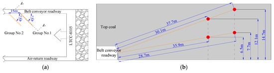 The layout of drill holes and measuring points: (a) The layout of drill holes group No. 1 and group No. 2; (b) Cross-sectional view from A–A.