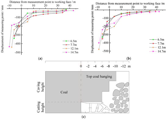 The relationship between the displacement of the measuring point and the distance from the measuring point to the LTCC-8105 working face is shown in Figure 8. Figure 8a,b show that the low level top-coal (h = 6.5 m and h = 7.7 m, respectively) began to collapse at a distance of 7 m behind the working face, whereas the high level top-coal (h = 12.1 m and h = 14.7 m, respectively) began to collapse at a distance of 9–10 m behind the working face. The length of the chock support caving shield was 6.5 m only, thus an overhanging of top-coal was formed above the supports, as shown in Figure 8c. Based on the above-mentioned analysis and measured results, it can be concluded that the top-coal is too hard to collapse in time and the top-coal overhanging that formed behind the support is also a main reason for the intense strata behavior and chock support failure accidents in working faces.