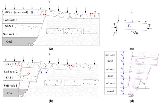Prior to the determination of support capacity, the structural characteristics of key strata [25], which control the overlying strata movement, should be identified. Generally, if the key strata are close to the coal seam or the thickness of coal seam is large, the key strata will be located in the caving zone and form a cantilever beam structure (CBS), while if the key strata siting is far away from the coal seam or located in the fractured zone, it will be hinged together (i.e., the broken blocks of key strata can be hinged with each other) to form a voussoir beam structure (VBS) [24], as shown in Figure 10a. According to the observed results of the height of the caving zone in the longwall top-coal caving face of the extra-thick coal seam in the Datong coalfield [2] and the determination method of the structure of the key strata [24], it can be concluded that the sub-key stratum (SKS) 1 of LTCC-west8101 forms the CBS, whereas the SKS 2 (main roof) forms the VBS, as shown in Figure 10b.