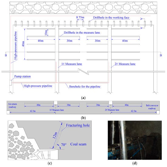 Drill holes layout and site operation in LTCC-west8101: (a) Plan view; (b) Cross-sectional view from B-B; (c) Cross-sectional view from A-A; (d) Drilling construction of the horizontal drill hole.