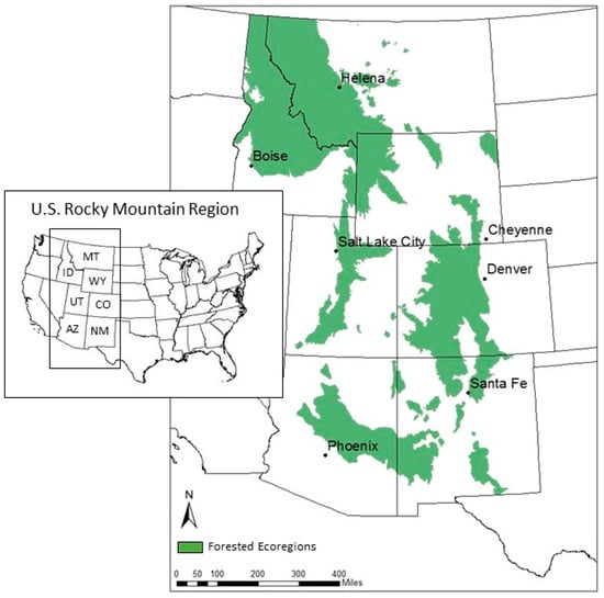 In the Rocky Mountain region of the western U.S. (Figure 1), there are substantial stocks of woody biomass associated with meeting forest management needs. Large areas of forest have become densely overstocked and substantially departed from historic, fire-resilient conditions because of decades of fire suppression, livestock grazing, and poor timber harvesting practices [,]. It is widely acknowledged that these conditions, together with climate change, have contributed to the escalating extent [,] and severity [,] of wildfire in the region. Furthermore, there is evidence that dense forests coupled with warmer winters and prolonged drought led to the largest bark beetle outbreak ever recorded in North America [,]. In Colorado, over 6.6 million acres of forestland have been negatively affected by the mountain pine beetle [], with similar landscape-scale impacts caused more recently by the spruce bark beetle [].