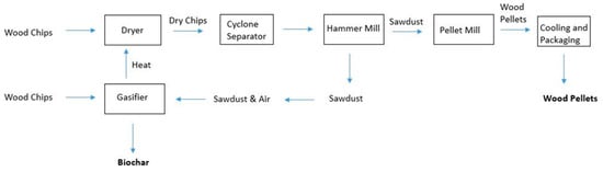 Schematic diagram of process heat from gasification with pellet and biochar production.