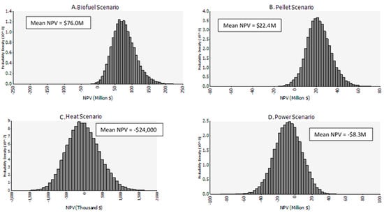 Mean values of NPV are presented for each scenario in Table 4. The Biofuel Scenario has the highest mean NPV, at $76.0 million over the 20-year project period, followed by the Pellet Scenario with mean NPV of $22.4 million. The Heat Scenario comes next, with a mean NPV that is just below zero, at −$24,000. The Power Scenario has a mean NPV of −$8.3 million, and is the only scenario with substantially negative mean NPV over the 20-year project period.