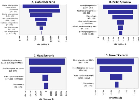 Tornado Graphs of Uncertain Parameters Ranked by Effect on NPV, by Scenario. (A) Biofuel Scenario: The price of biochar has the largest effect on NPV. Price and conversion rate of biofuel have the smallest effects. (B) Pellet Scenario: Price of pellets has the largest effect on NPV. Price of biochar has the smallest effect. (C) Heat Scenario: Value of heat has the largest effect on NPV. Discount rate has the smallest effect. (D) Power Scenario: Price of electricity has the largest effect on NPV. Discount rate has the smallest effect.