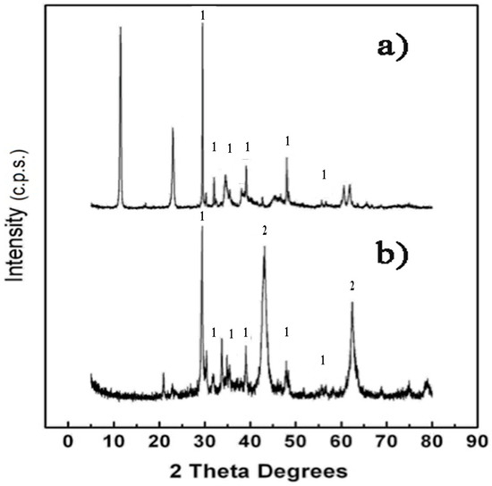 The X-ray diffraction (XRD) pattern of hydrotalcite samples (Figure 1a) shows sharp and symmetric peaks, which indicates that the sample was correctly crystallized. After calcination (Figure 1b), decomposition of hydrotalcite (HT) resulted in the formation of mixed Mg-Al oxide phases. As a result, typical HT peaks (2) and characteristic diffraction at 43° and 63° corresponding to the mixed Mg-Al oxides were clearly observed [27]. This can be explained by the destruction of the hydrotalcite structure and production of mixed oxides during calcination. This fact was confirmed by the XRD pattern of the calcined samples, as shown in Figure 1b. However, either calcined or not, several peaks (1) corresponding to sodium nitrate may be noticed, suggesting the existence of different chemical species in the HT, such as NO3− and Na+, due to the removal of the washing step; this could have significant importance in the catalytic process, as these species add an homogenous contribution to the heterogeneous catalysis, thereby enhancing it [28].