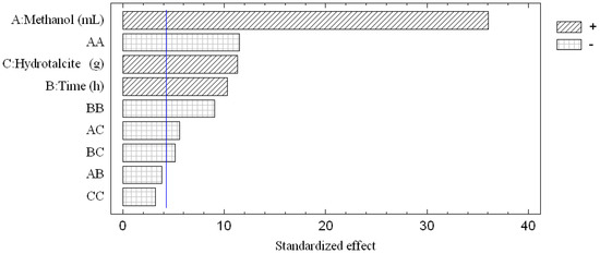 RSM was applied both to evaluate the influence of reaction time, amount of HT, and methanol-to-oil ratio on biodiesel production and to find out the conditions involved in the optimization. Before that, an experimental design comprising 15 trials was carried out (Table 2 and Table 3). The experimental design was used to screen some of the most significant parameters involved in biodiesel transesterification (time, catalyst quantity, and alcohol:oil molar ratio) and to find out the potential correlation between them. Upper and lower limit values of variables were chosen with consideration to the literature [19]. With this in mind, the Pareto chart (Figure 2) shows that all selected variables, separately considered, have a positive effect on FAME content; amount of methanol shows the most significant effect, as opposed to time, which has the lowest positive effect. Interaction between parameters shows a negative effect over the response variable, the highest significance being provided by AA (methanol-to-oil molar ratio). Comparisons between experimental and simulated values (from the quadratic model) are shown in Table 2 and Table 3; the model provides a good fit to the data. The best experimental FAME conversion yield (86.23% w/w) was achieved with the use of 3.4 g of catalyst (8.5% w/w) and 27.5 mL of methanol (8:1 molar ratio of alcohol/oil) during 3.12 h of reaction time. Although the biodiesel yield did not fulfill biodiesel standard specifications (EN 14214), and would therefore need to be blended with diesel fuel to run diesel engines, this result might be considered satisfactory with regards to previous results reported by other researchers: in most of the previous results, mild reaction parameters hardly achieved yields of 70% [29,30]; in others, longer reaction times [21] or higher reaction temperatures [23,31] were needed, thus increasing the final cost.