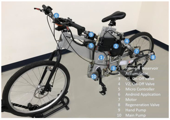 - Chang, L.; Yao, J.F. The development of the electro-hydraulic driving bicycle. Appl. Mech. Mater. 2013, 373, 2132–2135. [Google Scholar] [CrossRef]