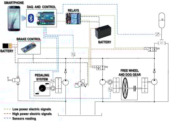 The whole system circuit is represented in Figure 2, which integrates the ISO schematic of the hydraulic system, the mechanical connections through gearboxes to the pedals and the wheels, and the electronic controller. All these subsections of the system will be detailed in the following sections of the paper.