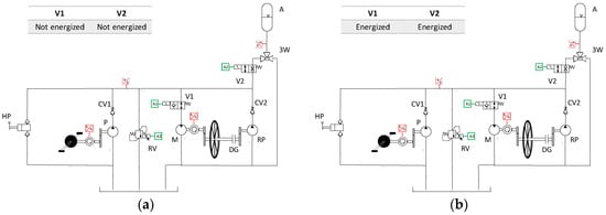 Pedaling (Figure 3a). When neither of the solenoid valves V1 and V2 is energized, the vehicle operates in this mode, replicating the functioning of a traditional bicycle. This implies that the vehicle can also be operated in this mode in case of insufficient battery, or in the case of a failure of the electronic control system. In Pedaling Mode, the rider spins the pump shaft through the pedals, and the pump flow is sent directly to the motor connected to the rear wheel.