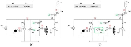 Boost (Figure 3c). The boost mode is realized when only V2 is energized. This is the mode used to release the energy stored in the accumulator. The boost mode can be used when the cyclist wants to move the bike without pedaling.