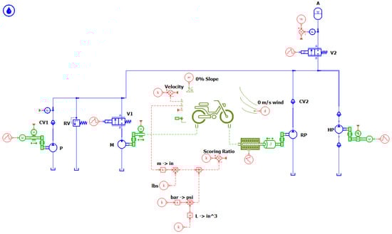 As is shown in the AMESim model schematic provided in Figure 4, the main pump is connected to the pedals with a gearbox of variable transmission ratio, while the motor is connected to the wheel with a gearbox of variable gear ratio. Both gearboxes are assumed to be ideal (unit efficiency). The hydraulic valves are assumed ideal (no pressure losses), as well as the connecting lines. Realistic volumes for the connecting lines are assumed to consider their capacitance effects.