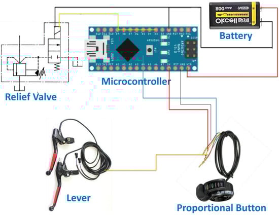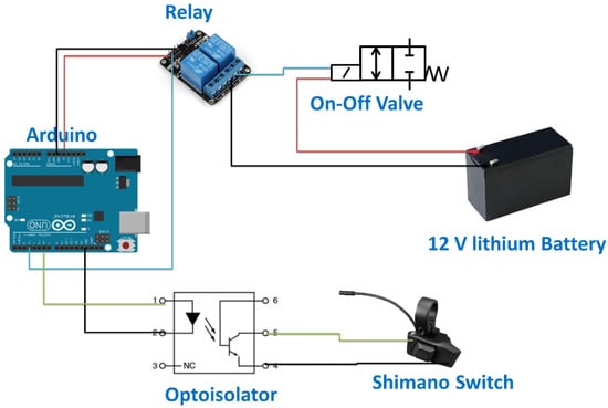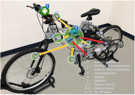 This section provides a general overview of the system on the basis of the PurdueTracer vehicle developed within this study. PurdueTracer reproduces the configuration of a traditional bicycle (Figure 1); however, it integrates an electro-hydraulic and a hybrid system used for the motion transmission. The solenoid valves determine the configuration of the hydraulic system, and they are controlled using an Arduino controller that communicates via Bluetooth with a smartphone application. The overall electronic control system applies the concept of the Internet of Things (IoT), providing the cyclist with a smartphone application to control PurdueTracer, with functional aids in promoting the user experience.