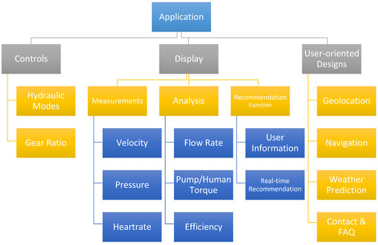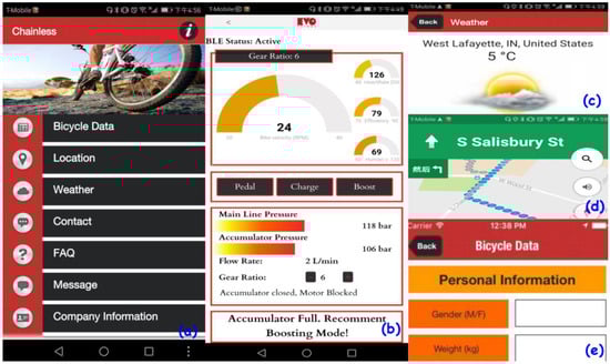 Another level of human–machine interaction that affects the performance of the cyclist is related to the visual aids and monitoring devices available during the physical exercise. It is proven for almost all intensive sport activities (gym cardio equipment, jogging, cycling) that the ability to monitor the human status, e.g., the heart rate, the instantaneous power consumed, etc. as well as vehicle performance data (pedaling speed, vehicle velocity) can improve the human ability to achieve certain performance goals. All these human factors related to the structural design of the chassis as well as the ease of monitoring and control of the vehicle were addressed in the proposed design. In particular, a smartphone app was developed for PurdueTracer to enable all the desirable features of a modern and intelligent vehicle, which could potentially encourage potential users to use smart hydraulic bikes like the one proposed in the research done by Navarro et al. [19].