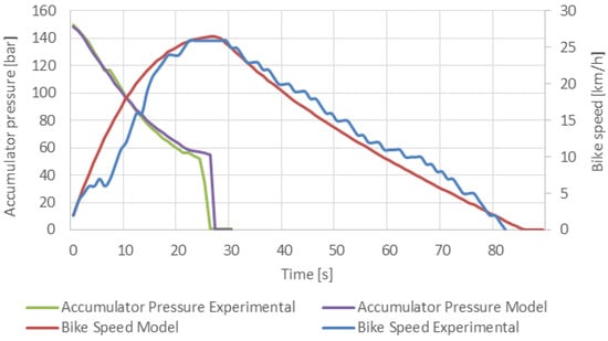 The simulation model is suitable to perform transient analyses of the vehicle operation. For example, Figure 6 reports the case of a simulation where the accumulator is first charged to 200 bars for 100 s in Charging Mode. After this initial phase, a Boost Mode is simulated to replicate the vehicle acceleration. Then, the cyclist starts to pedal the vehicle at 220 s and reaches a constant speed at 280 s. Finally, the regeneration system is activated at 320 s, stopping the vehicle within 10 s.