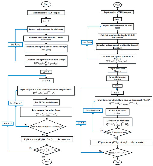 Furthermore, to compare the direct PLF approach with an indirect PLF, the probabilistic forward/backward sweep (PFBS) method is run for the radial distribution system in the presence of the WFs by the two above mentioned approaches: K-means data clustering-based and simple data-based MCS. The PFBS method is based on the direct application of Kirchhoff’s voltage and current laws [26]. Furthermore, the simulation run-time comparison between the proposed direct PLF and the indirect PFBS is carried out, to figure out the effectiveness of both PLF methods.