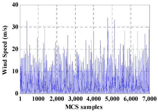 The IEEE 33-bus radial distribution system (Figure 3) is employed as the first case study to investigate the performance of the proposed method. In this system, a WF is connected to the system in bus-33. It should be mentioned, in the operation process of the K-means data clustering algorithm, the wind farm can be connected to the each of the buses in the considered distribution system. This means that the proposed algorithm is independent of the connected bus of the wind farm. Details about this test system are addressed in [32]. Table 1 lists the parameters of the wind turbines. Figure 4 shows the wind speed for 7000 samples. Base kV is taken as 12.66 kV and base MVA is considered to be 1 MVA. Figure 5 demonstrates the PDF of the wind speed samples, and the CDF of samples for wind speed and turbine output power. Also, the center of clusters after convergence achieved in data clustering is presented in Figure 6.