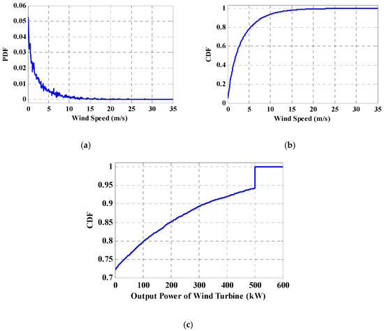 Cumulative distribution function of wind speed and wind output power. (a) PDF of wind speed samples, (b) PDF of wind speed samples, (c) CDF of turbine output power.