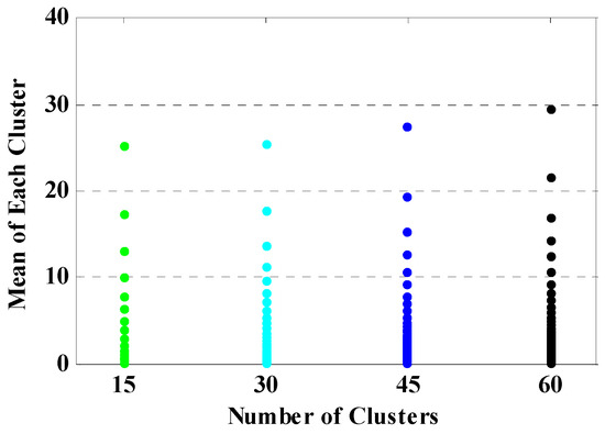 For Case 1.1, input data (output power of WF and system load) are classified into different amounts of clusters, including 15, 30, 45 and 60 clusters. For cases 1.2, the values for selective buses in the MCS process are obtained at the iteration 7000. For instance, Figure 7 illustrates a convergence trend of the voltage magnitude of bus-33 for 7000 iterations of MCS, using the proposed direct PLF. In addition, the voltage convergence of bus-33 for clustering-based MCS is demonstrated in Figure 8. As shown, in higher number of clusters, the convergence of clustering-based MCS is closer to unsorted data-based MCS.