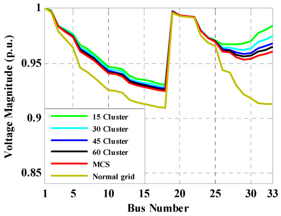 Voltage profile with the proposed data clustering-based direct PLF with different number of clusters (33-bus system).