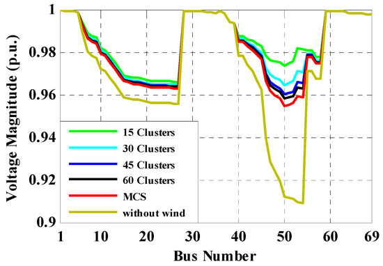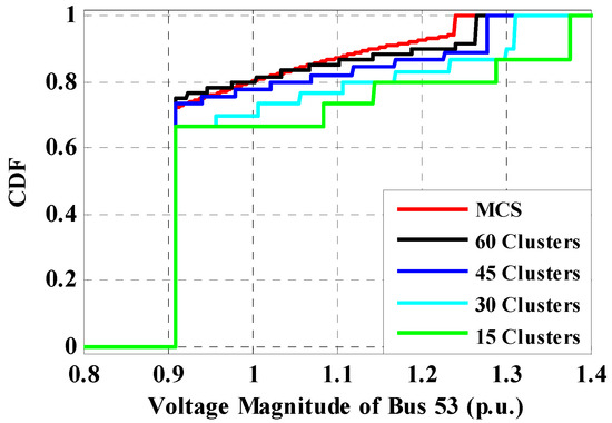 For Case 2.1, input data (output power of WF and system load) are classified into 15, 30, 45 and 60 clusters. For Case 2.2, the values for selected buses are obtained at iteration 7000. The results of evaluations of Case 1.1, Case 1.2, Case 2.1 and Case 2.2 are shown in Table 2. This table demonstrates the results of the selected bus voltage magnitudes for each case. For Case 1.1 and Case 2.1, it is found that by increasing the number of clusters, the selected bus voltage (e.g., Bus 18) magnitudes are found close to the results of MCS using unsorted data. The results using direct PLF and indirect PFBS approaches are found to be pretty close. As is obvious in Table 2, for all buses shown, the V magnitude from clustered data, regardless of the number of clusters, is always higher than the unsorted data. This is because of the higher relative value of the center of clusters (representative of the clusters for the wind speed) in the data clustering approach in comparison with unsorted data, in MCS. Table 3 exhibits the simulation run-time for the proposed direct PLF method and PFBS approach. As shown, the run-time for the proposed direct PLF is much smaller than PFBS and the run-times for both of them are smaller than the unsorted data-based MCS approach, which illustrates the effectiveness of the K-means clustering algorithm. To be more accurate, the voltages of all buses with the proposed data clustering-based direct PLF are demonstrated in Figure 9, and the magnitudes are listed in Table 4. Figure 10 shows the CDF of voltage for samples and the mean of clusters for bus-33. It should be noted that if the number of clusters decreases, the accuracy of the results of selected bus voltage magnitudes decreases, and if the number of clusters increases, the run-time increases.