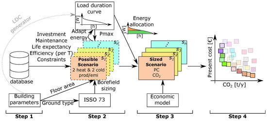 The methodology used by the developed tool to optimize the HVAC system for a given building is schematically represented in Figure 1, which shows the four steps that are consecutively carried out.