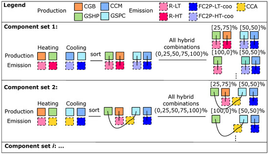 The second step is to generate all possible HVAC scenarios composed of the devices present in the database, which can deliver the energy and thermal powers of the given LDC using the HVAC components of the database. In order to limit the number of possible scenarios, a scenario can contain a maximum of two heat and two cold production systems, each coupled to its own emission system. Note that reversible components count for two: one for heating, one for cooling. Figure 2 illustrates how the different scenarios are generated. Firstly, a set of production and emission systems is taken from the available components of the database. Secondly, the production systems are sorted by decreasing efficiency and the heat (cold) emission system with the lowest (highest) supply temperature is coupled to the most efficient heat (cold) production system. The maximum heating (cooling) power present in the LDC can now be divided between the two heat (cold) systems according to predefined hybrid fractions (currently set as [0, 25, 50, 75, 100]%). Note that both the heating and the cooling hybrid fractions can vary independently, that coupled production and emission systems are sized together, and that, when a 0% hybrid fraction is allocated, this means that the component is not installed. When a reversible system is installed, it will be sized by the maximum of its heating and cooling powers, taking its cooling to heating power conversion factor (see Table 3) into account. This is necessary as, for example, the cooling power of a high temperature 4 pipes fan coil unit (FC4P-HT) at its nominal conditions is only 60% of its heating power due to the smaller temperature difference between the air of the zone and the fan coil supply water for cooling than for heating.