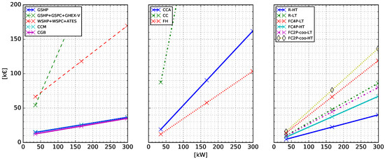 Cost function of each component included in the database. 30 W/m for the borefield and 40 W/m (heating) for Concrete Core Activation (CCA) are assumed to convert the cost function variable to kW. All powers correspond to the nominal heating power of the device, except for FC2P-coo-LT and FC2P-coo-HT for which the nominal cooling power is used instead. The meaning of the legend entries can be found in Table 1.