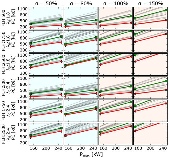 Figure 4 plots the PC of each M-Sce for the different parameter values of Table 4. Each row assumes a different FLHh and , each column a different while the x-axes specify , and each line represents a different M-Sce. The lines representing GEOTABS-M-Sce are plotted in green with square markers and the lines referring to the most conventional scenario type (Conv-M-Sce) (composed of a CGB, a CCM and FC4P-HT) are plotted in red with diamond markers. Finally, the background of the graphs is set in blue if GEOTABS-M-Sce extract more heat from the ground than they inject (i.e., the borefield is heating dominated) and in orange otherwise.
