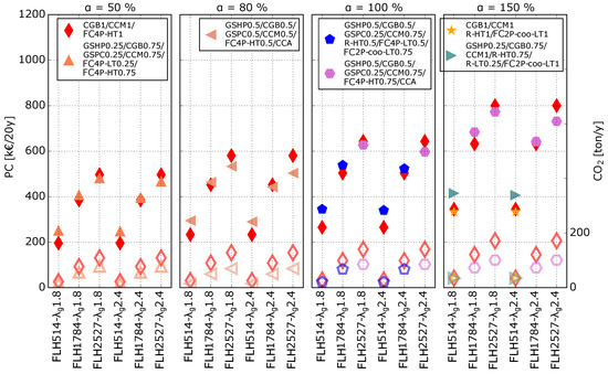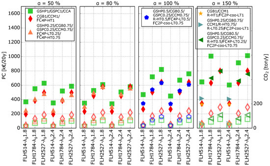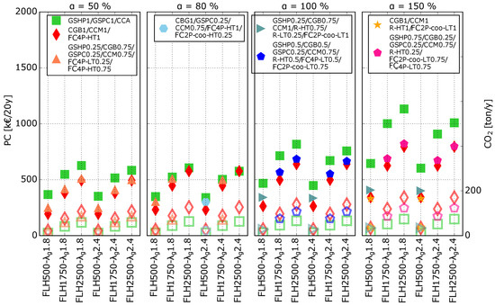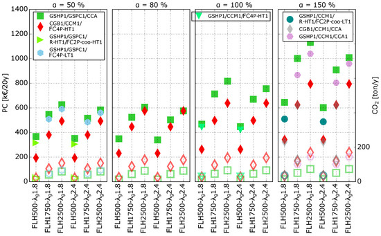 Figure 5 contains the same information as Figure 4 evaluated at kW, but the CO emissions are added to the figure. The left y-axis represents the PC (filled markers) of the M-Sce (in €/20y) and the right y-axis returns the CO emissions (unfilled markers) in ton/1y, the x-axes indicate the number of FLHh and , and each subplot corresponds to a different value. For each condition, the GEOTABS-M-Sce and the Conv-M-Sce are plotted with green square markers and red diamond markers, respectively. Additionally, M-Sce* and the cost optimal geothermal scenario (Geo-Sce*) are also included if they differ from GEOTABS-M-Sce and Conv-M-Sce. Finally, the CO emissions of each plotted scenario are represented by the same (but unfilled) marker, and their value is to be read on the right axis.