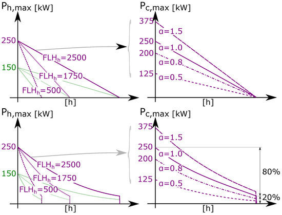 The shapes of the triangular LDCs are chosen such that they correspond to the , FLHh, and values of Table 4. Figure 7 and Figure 8 assume a of 27 W/m and 70 W/m, respectively, resulting in different optimal scenarios as the CCA (if installed) is a factor 2.6 cheaper for the latter (CCA are assumed to cover a fixed 80% of the building floor surface area), but it needs to be complemented with an auxiliary emission system to provide enough thermal power.