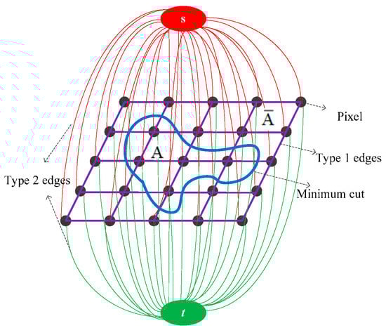 t. The capacity of type 1 edges denotes a difference between adjacent pixels, and the capacity of type 2 edges denotes the probability that a pixel belongs to the foreground or background. For example, if a pixel belongs to foreground, the capacity (the probability that it belongs to foreground) between the pixel and