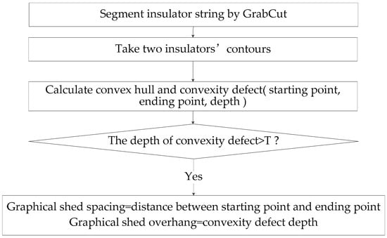 As the contours of insulator string are convex graphical shed spacing (D) and graphical shed overhang (P) are calculated by recognizing convexity defect of insulator contours after GrabCut-based segmentation.
