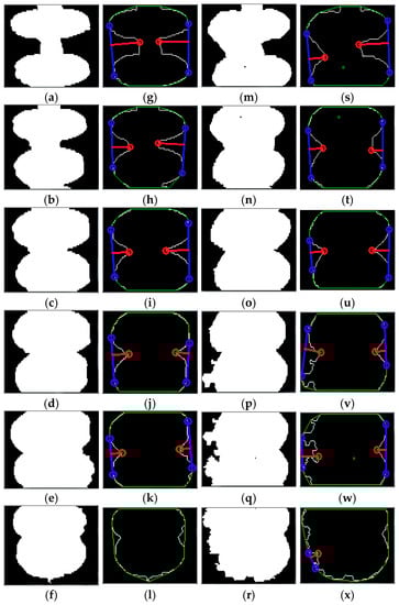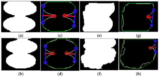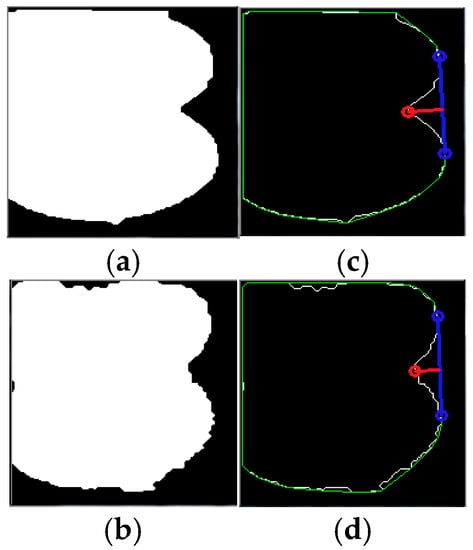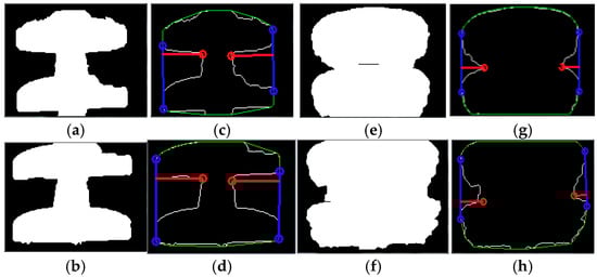Figure 4b, the starting point and ending point are intersection points of convex hull and convexity defect, which are marked with blue points. The deepest point of a convexity defect is one with maximum vertical distance from contours of insulator to convex hull, which is marked with a red point. The depth of a convexity defect refers to the vertical distance from the deepest point to the line