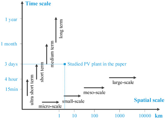 Currently, the time scales such as ultra-short term (15 min to 4 h ahead), short term (several hours to 3 days ahead), medium term (several days to 1 month ahead) and long term (1 month ahead or longer), have been studied for PV power forecasting. The spatial scales such as the micro-scale, small-scale, meso-scale and large-scale, can be interpreted by corresponding to a PV unit, a PV plant, PV plants cluster, and regional PV plants, respectively, shown in Figure 1. With different combinations of time scales and spatial scales, the power forecasting accuracy will be different [5]. Time scale and spatial scale of the studied PV plant here are located in Figure 1. As a result, the short-term and small-scale forecasting problem is addressed.