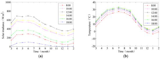 Figure 3a,b are the annual time-sharing display charts of solar irradiance and ambient temperature in the whole year from November 2016 to October 2017, respectively. They show the overall trends of solar irradiance and ambient temperature in different seasons of a year.