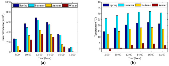 Figure 4a shows the average solar irradiance per month at different times of a day. Along the abscissa axis, the differences of the amplitudes in different months at a certain time vary between 150–300 W/m2. Along the ordinate axis, the amplitudes at different times in a certain month vary greatly, and are affected by the sunrise and sunset. At all timepoints, the amplitudes of spring and summer are greater than autumn and winter. In January, the minimum amplitudes appear mostly at all times of a day. Figure 5a displays the average solar irradiance of each season at different times of a day, such as 8, 10, 12, 14, 16, and 18 o’clock. It can be seen that the solar irradiance obviously changes with the season. The descending order of the average solar irradiance in different seasons at all times of a day is spring, summer, autumn, and winter.