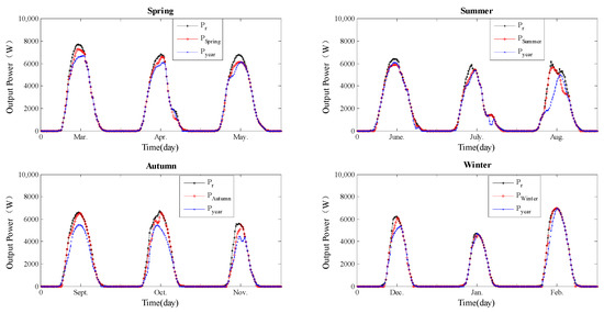 where, PSTC is the standard output power of a PV module which corresponds to the solar radiation intensity = 1000 W/m2 and the temperature = 25 °C; is the power-temperature coefficient of a PV module; is the actual solar irradiance at instant t received by the PV module; is the ambient temperature at instant t [43]. Obviously, output power of a PV module is mainly determined by the solar irradiance and the ambient temperature.
