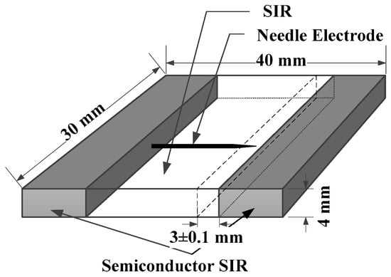 In this study, we chose the needle-plate electrode model to study the electrical tree characteristics []. The two-component high-temperature vulcanization (HTV) liquid SIR (produced by Chinese Blue-star Chemical Company, Chengdu, China) was selected. Figure 1 shows the sample’s schematic with needle-plate electrode system. The details of the needle electrode are as follows: The cone angle was 30°, the diameter was around 250 μm, and the curvature radius was 3 μm. The needle electrode was connected to one semiconductor in a steel mold, and the vertical distance between the tip and the other semiconductor was adjusted to (3 ± 0.1) mm (shown in Figure 1). The well-mixed liquid SIR was poured into the mold. This process has been proven to avoid mechanical destruction near the needle tip as much as possible. Then, another flat steel was placed to cover it. Finally, the steel mode with the poured liquid SIR and needle tip was put under a hot-press machine at 165 °C and 6 MPa for 10 min to form the test SIR samples.