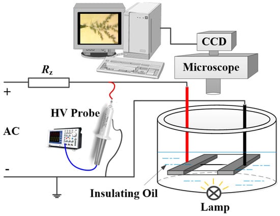 To analyze the electrical treeing development and growth pattern, a constant voltage was used. We recorded videos of the growth process of electrical trees and measured the tree length simultaneously. The experimental system is shown in Figure 2. Rz is a protection resistance of 20 MΩ. The microscope, CCD camera and a computer were used to observe tree characteristics clearly. A high-voltage (HV) probe (P6015A, produced by Tektronix, Inc., Beaverton, OR, USA) was used to measure the voltage across the samples (the divider ratio is 1000:1).