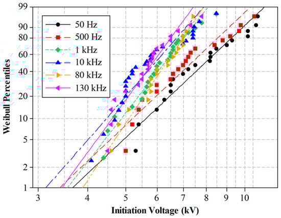 Figure 3 shows the electrical tree initiation voltages at different voltage frequencies. It can be seen that they agree with the Weibull’s distributions well. The distribution of α and β are shown in Table 1. As mentioned above, α is the voltage with initiation probability of 63.2%, β is the parameter representing the data’s dispersion. As the voltage frequency increased from 50 Hz to 130 kHz, α decreased by 27.9% from 8.5 kV to 6.13 kV, while β had increasing trend as the voltage frequency increased. The bigger β means the smaller data deviation, thus, the deviation of electrical tree initiation voltage decreases with increasing voltage frequency. Moreover, as the voltage frequency increased from 50 Hz to 1 kHz, α decreased by 22.4% from 8.5 kV to 6.59 kV. However, there was no obvious reduction of α above 1 kHz.