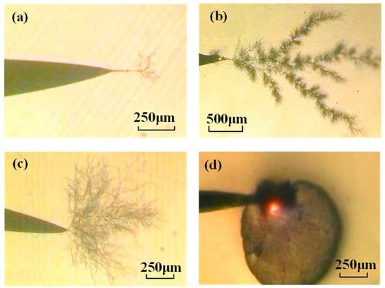 Four typical electrical tree shapes in SIR: (a–c) are branch-like trees, pine-like trees, and bush-like trees, respectively; (d) is bubble-shaped deterioration (applied by 7.8 kV with 130 kHz).