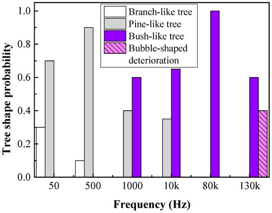 The probabilities of different initiated tree shapes at different voltage frequencies (within 1 min) are displayed in Figure 5. As the voltage frequency increased, the tree became denser. This phenomenon could be divided into three stages. In the first stage, for voltage-frequency values ranging from 50 Hz to 500 Hz, branch-like and pine-like trees were generated, there being a greater probability of the latter. In the second stage, after a break point of 1 kHz, bush-like trees were generated, and within voltage frequencies from 1 kHz to 10 kHz, their probabilities remained constant. It should be noted that this break point (1 kHz) is consistent with the initiation voltage behaviors discussed above. In the third stage, when the voltage frequency is higher than 10 kHz, all of the initiated trees became bush-like trees. In particular, when the voltage frequency exceeded 100 kHz, bubble-shaped deterioration was observed.