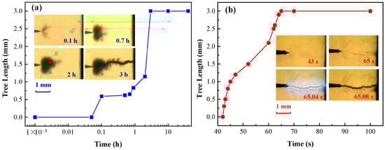 Figure 6a shows a typical bush-like treeing pattern at 50 Hz and the corresponding growing length. When a tree was initiated after the application of a voltage for 3 min, bush-like electrical trees were formed. When the total time was 0.1 h, trees stopped growing and the tree lengths remained stable between 0.1 h to 0.9 h. After that, large new channels formed in front of bush-like trees, and trees grew rapidly until they broke down. The total time from tree initiation to its breakdown was about 3 h. Figure 6b illustrates a typical pine-like treeing pattern at 50 Hz and the corresponding growing length. Pine-like trees were generated under a higher excited voltage, and the speed of growth was faster. The pine-like trees developed rapidly until they were punctured, and the whole process took less than 1 min.